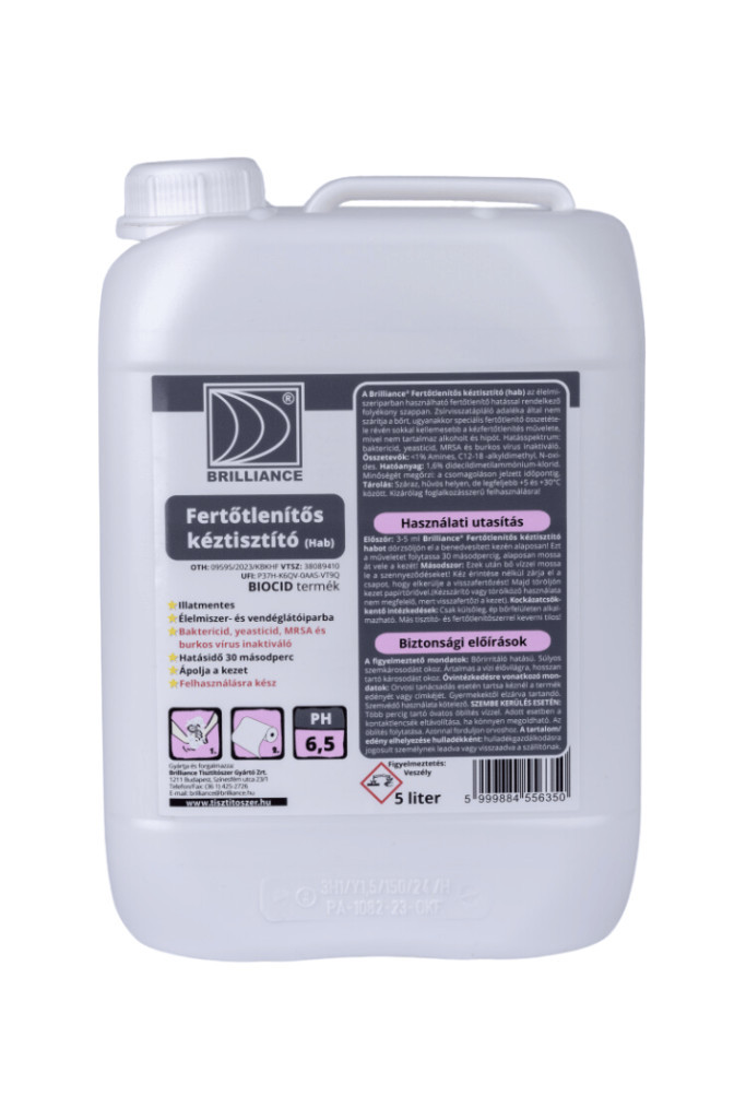 A Brilliance® Fertőtlenítős kéztisztító hab az élelmiszeriparban (HACCP) is használható fertőtlenítő hatással rendelkező folyékony szappan. Zsírvisszatápláló adaléka által nem szárítja a bőrt, ugyanakkor speciális fertőtlenítő összetétele révén sokkal kellemesebb a kézfertőtlenítés művelete, mivel nem tartalmaz alkoholt és hipót. Hatásspektrum: Baktericid (MRSA), yeasticid, burkos vírus inaktiváló