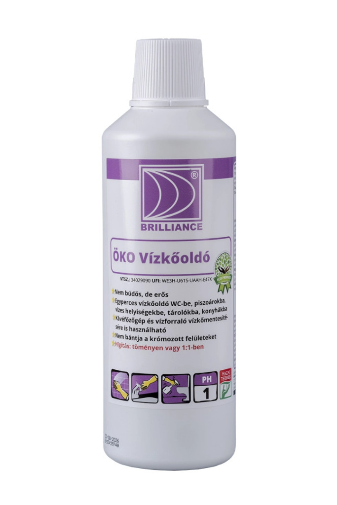 A Brilliance® ÖKO Vízkőoldó egy azonnal ható vízkőoldó, ami könnyedén megszünteti még a termál- illetve gyógyfürdőkben keletkezett vastag és mással nem vagy nehezen eltávolítható vízkövet. Ezen kívül a gyengébb vízkőre hígítva is alkalmazható. Nagy előnye, hogy nem büdös, mint a sósav és környezetbarát ellentétben a foszforsavval.Eltartható: a csomagoláson jelzett időpontig.Tárolás: napfénytől védett, hűvös helyen, +5°C és +30°C között!
